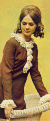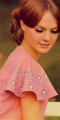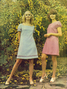 Frühlingskleider für junge Mädchen - individuell ausgestattet mit gestickten Röschen in Verbindung mit Biesenstepperei. Das Modell mit langen Ärmeln, erhielt eine Blütenranke viermal untereinander auf den Possenteil gestickt. Daneben wurden auf jede Seite drei Biesen gesteppt, Der Rock ist leicht gereiht angesetzt - den Ärmel faßt ein ziemlich breites Bündchen zusammen. Am mittleren Modell sind die kleinen Ärmel und die Kante des ausgestellten Rockes mit einer in zwei Farben gestickten zierlichen Rosenranke geschmeckt. Am Kleid mit Biesenstepperei auf der Passe, rechts, wurde ein größeres Motiv, auch wieder mit Röschen, auf die modischen, sehr kurzen Puffärmel gestickt. Wir stellten für diese Stickerei die Farben Dunkelrot, Rosa und Violett zusammen. Das verwendete Strukturleinen, das sich auch für andere Handarbeiten, wie Tischdecken und Kissen gut eignet, stellte uns dankenswerterweise der VEB Textilwerke Einheit, Glauchau, zur Verfügung.