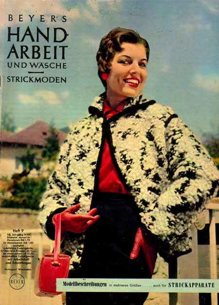| Unser Titelmodell: Weiß-schwarz geflammtes handgesponnenes starknoppiges Wollstrickgarn ist zu dieser herrlichen Jacke verarbeitet. Apart ist der Kragen, großzügig die Linienführung, der Ärmelansatz wurde mit einer schwarzen Blende betont. Die Jacke, die Ärmel und Taschen sind ebenfalls mit einer schwarzen Mohairblende eingefaßt. |